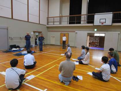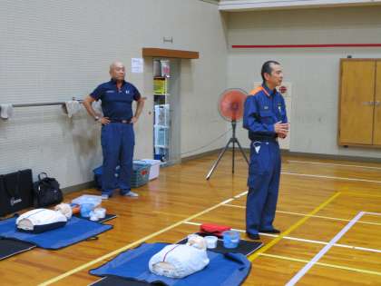 当日は30度を超える夏日で、体育館は非常に暑い中でしたが、右京消防署の救急からお見えになった講師の先生の軽妙な語り口で笑い声も起きる中、終始和やかな雰囲気で研修会が進みました。