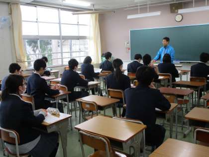 受検する3年生17名が校長先生からの激励のあいさつの後、緊張した面持ちで進路担当の先生から受験の注意を聞きました。