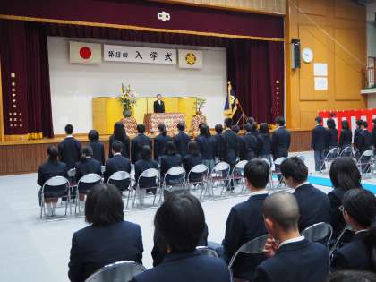 新しい制服に身を包んだ,43名の新入生が緊張と期待の入り交じった表情で入場し,一人ひとり呼名に大きな声で返事をしていました。
