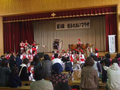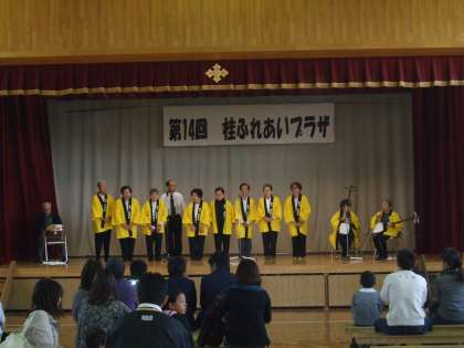 ステージ発表の様子です。上の写真は「桂川民謡会」下の写真は「桂徳小学校ブラスバンド教室」の皆さんです。