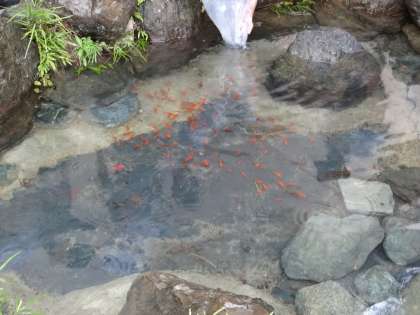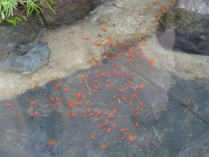 いつからか落ち葉や泥が堆積し,汚れてしまっていましたが,今日,最後に小さなゴミをとり除き,生まれ変わったかのようなきれいな池となり,金魚を放流しました。