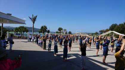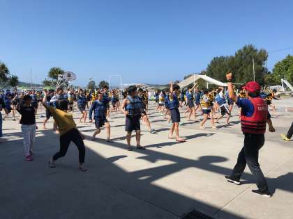 B団・午前中のマリン体験開始前のハイサイおじさんの音楽に合わせて準備体操をしています。