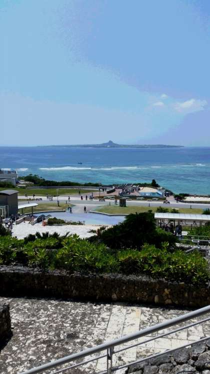 まずは,美ら海水族館の様子です。美ら海水族館からはくっきりと伊江島が見えます。たっちゅーも見えています。