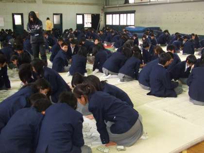 1/20(木)5限、冷え込む体育館において1年生249名による百人一首大会が行われました。この日のために冬休み中に1枚でもたくさんの札を覚えることを目標にし、1月に入ってからは学級活動や休み時間を使って練習してきました。部活動終了後の下校時にはお互いに問題を出し合いながらの風景も見られました。