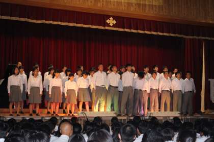 3年生の発表は、1年生から取り組んでいる戦争についての平和学習。「サトウキビ畑の唄」。合唱・ダンス・モザイク壁画・劇・平和ミュージアム等様々な表現方法で取り組んだ素晴らしい発表でした。
