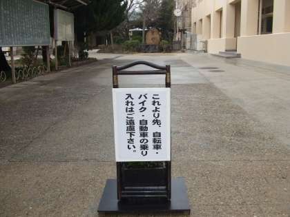 本校正門前から正面玄関にかけては、車・バイク・自転車などの乗り入れはお断りしております。(中庭に回っていただいております。)