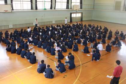 今日は第2体育館で、修学旅行の日程説明、集団行動訓練の1回目を行いました。今後は学級活動等でさまざまな事前準備を積み重ねて、本番を迎えることになります。