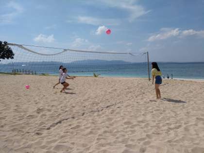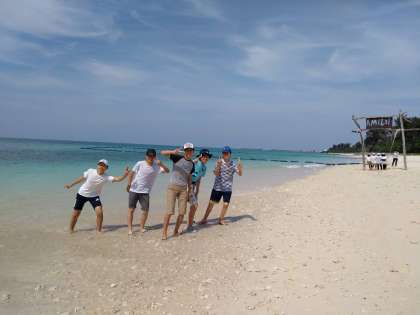各家庭と一緒に観光スポットや平和スポットを回った後は、10時に伊江ビーチに集合となっています。天気も最高のようです。早速集まっているグループもいます。