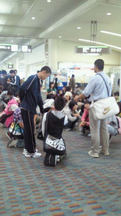 ほぼ定刻どおり無事那覇空港に到着し、荷物の取り出し中です。台風の影響で飛行機が大きく揺れたり、機内で気分が悪くなったりした生徒はいなかったようです。途中からは安全のためシートベルト着用の指示が出たままだったようですが皆落ち着いて行動できていたようです。