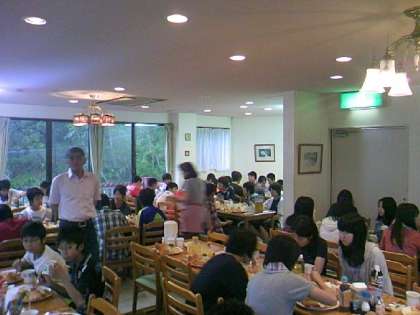 生徒数の最も多いにらい恩納の朝食の様子です。すでにバスはフェリー乗り場のある本部(もどぶ)に向かっています。伊江島に渡る始発のフェリー(9時発)に乗船します。