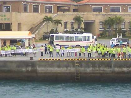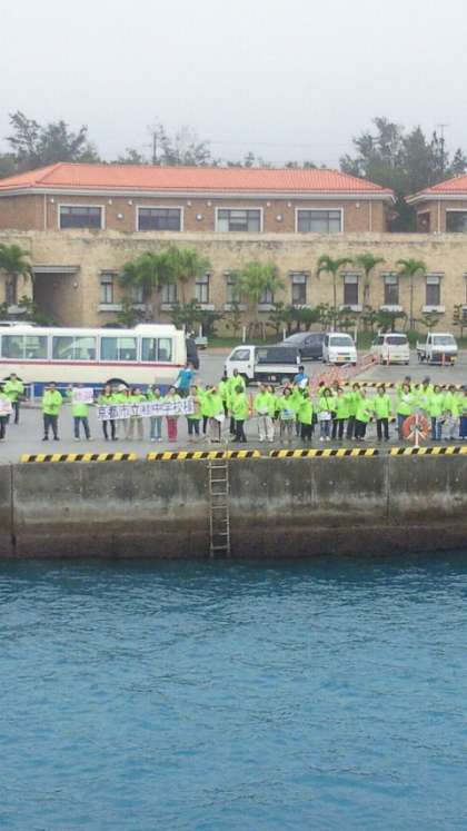 9時半、予定通り伊江島に到着しました。港にはすでにホストファミリーが「歓迎 京都市立桂中学校様」の横断幕を掲げて待ってくれています。