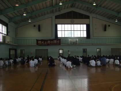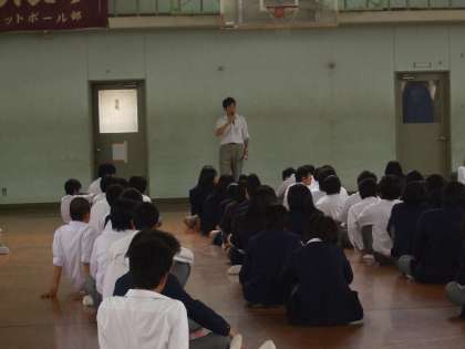 6/9(木)5限 第1体育館で2年生ケータイ教室を行っている一方の第2体育館では、3年生生徒対象に進路主事の先生から進路についての全体への説明が行われました。