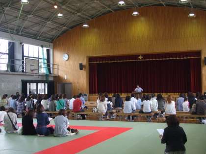 授業参観後の10:45〜50分間、各学年で懇談会が開かれました。3年生は体育館で進路(公立学校の入学者選抜制度)について進路主事からお話をさせていただきました。