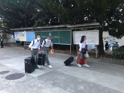 3年生がどんどん登校してきました。まずは,検温など健康観察。次に荷物のタグを配ります。連絡も事前に入り,予定通り集合しました。