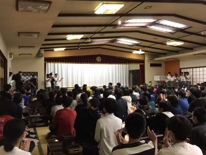 レクの最後に司会者と出演者に温かい拍手が送られて、修学旅行のレクは終了となりました。このあとはクラス毎に写真を撮って部屋に戻ります。その後は準備をして就寝となり修学旅行2日目が終わる予定です。