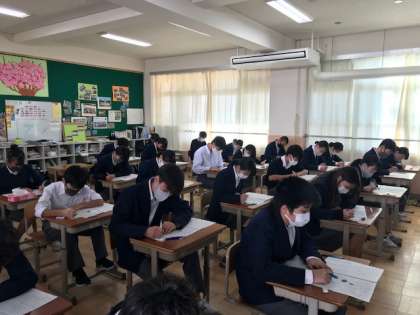 本日は総括テストの最終日になっています。初日から見ていましたが,どの学年も一生懸命に取り組んでいます。実力が十分に発揮できるように頑張って下さい。