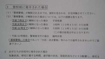 5月に「台風に対する非常措置のお知らせ」のプリント全校配布とこのホームページ掲載をいたしましたが、念のため本日再度皆様にお知らせいたします。