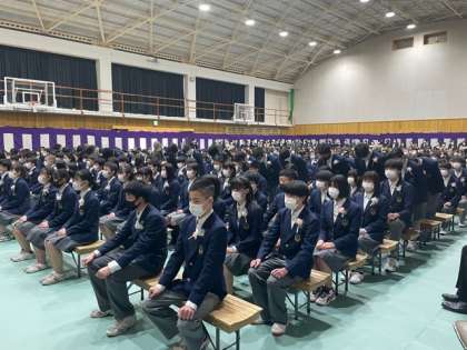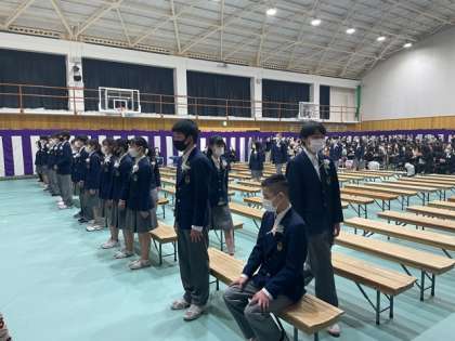 各クラスが入場し、整列して、いよいよ式が始まります。今回は国歌・校歌共に静聴となりました。誇りを持って、大きな声で校歌を歌ってほしかったのですが、今年は静聴となりました。次は「卒業証書 授与」です。呼名された生徒はその場で立ち、クラスの代表生徒が卒業証書を受け取ります。