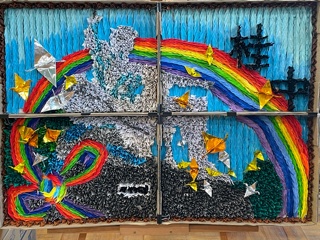 3年生は夏休み前の集会で,宮下先生から生活面の話、岩本先生から学習面の話がありました。その後、学級委員長達によるクイズがありました。少しでも学習しやすくなるように,生徒たちがアイデアを絞って行ってくれました。その後、修学旅行で平和のセレモニーで使う「千羽鶴」のお披露目がありました。平和への願いを込めて綺麗に作られています。よく見れば,鶴を縦に置いたり横に置いたり様々な角度において作成されています。丁寧な心のこもった「千羽鶴」になったと思います。