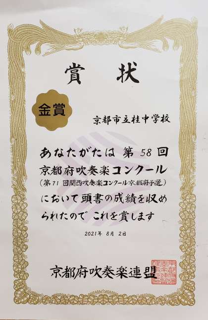 吹奏楽部、京都府吹奏楽コンクール中学校の部A 金賞受賞