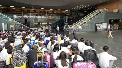学校長挨拶,実行委員長挨拶,添乗員さん,カメラマンの紹介,諸注意のあと,ホームへ移動します。