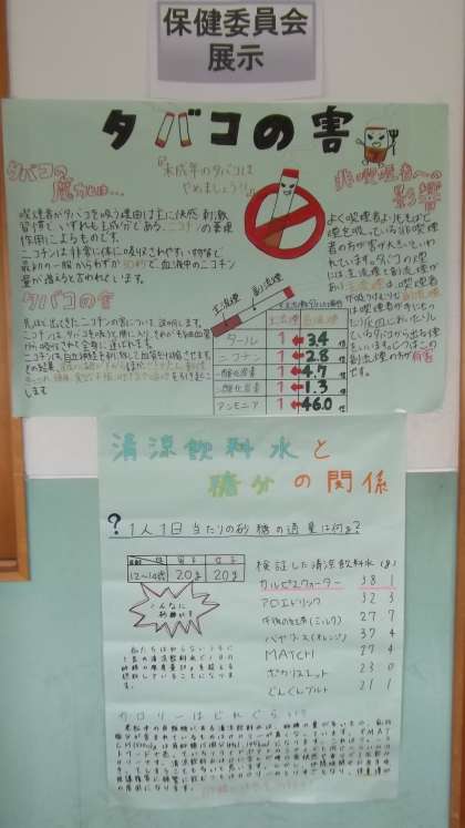 生徒会保健委員会が「たばこの害」と「清涼飲料水と糖分の関係」について調べてくれました。