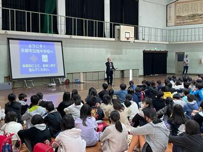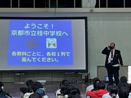 本日は午後から「桂中オープンスクール」が行われました。各小学校の6年生が桂中学校に集まり,来年に向けて学校の説明や授業を体験しました。最初は校長先生からのお話です。桂中学校の歴史なども話していただきました。中学校を少しでも身近に感じてくれるといいと思います。