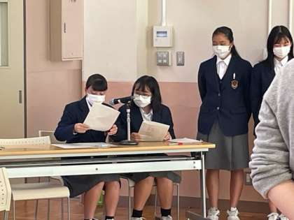 放送部の司会で始まり,旧生徒会本部の皆さんが一人ずつ挨拶を述べ,新しい生徒会本部へとバトンを渡しました。自分のやってきたことに対する総括と次の生徒会に対する期待やお願い,そしてこれからも支えていくという思いが伝わってきました。
