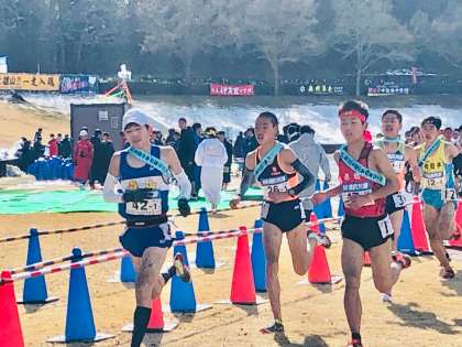 続いて,12:15スタートの男子の方は,エースの集まる激戦1区で第2集団をキープし,2区で4位,3区で2位まで順位を上げ,先頭は目の前というところまで追い上げると4区であっさりとトップに立ち,2位との差を広げて5区へつなぎました。