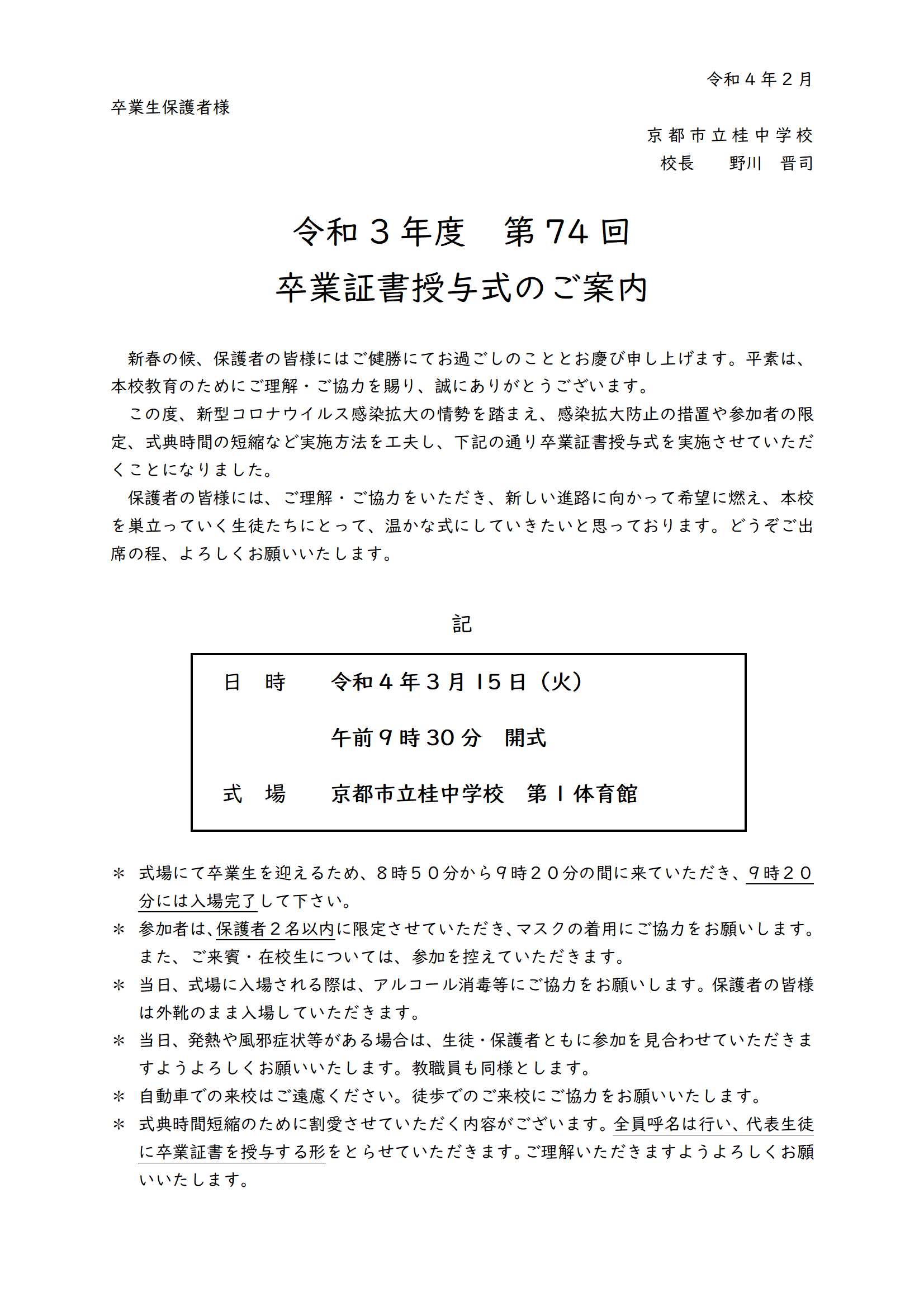 本日,卒業証書授与式のご案内プリントを3年生に配布します。また,ホームページにも掲載させていただきますのでご確認下さい。今後,変更になる可能性もございますので,その際はまたご連絡させていただきます。ご理解・ご協力をよろしくお願いいたします。