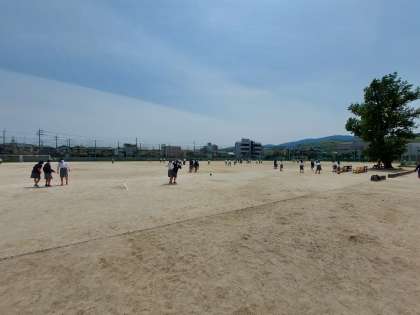 多くの生徒が晴天の下,グランドで汗を流しています。