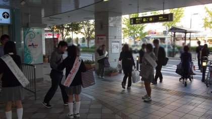 また、生徒会代表委員は電車で桂駅に向かい、東口・西口に分かれて環境・資源の有効利用などを訴えたカード入りのポケットテッシュを道行く方々に配布しました。