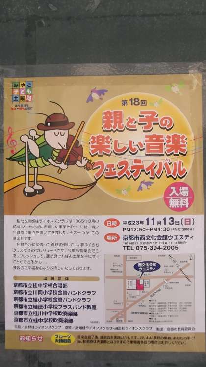 11/13(日)、本校吹奏楽部兼合唱部は京都桂ライオンズクラブ主催の西文化会館(ウエスティ)で開催される「第18回親と子の楽しい音楽フェスティバル」に出演します。合唱部として13時から15分間オープニングを飾ったのち、15時10分からは吹奏楽部としてもエンディングをつとめます。
