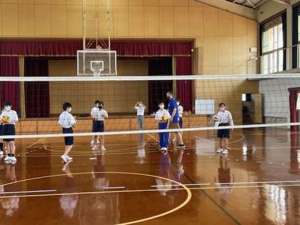 自己紹介をしたり,タオルを使って踊りながら準備運動をしたり,バレーボールをしたりみんな頑張っていました。