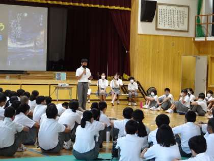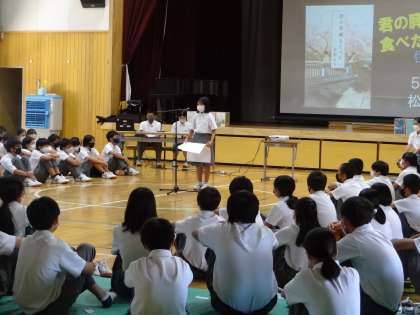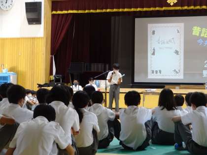 今日の4時間目は体育館に学年で集まり、ビブリオバトルの学年大会が開催されました。これまで各クラスで勝ち抜いてきた6人が、どれだけ「紹介する本を読みたいと思ってもらえるか」を競いました。どのバトラーも、なかなか魅力的なスピーチを発表。是非、手に取って読んでみたいと思わせる発表ばかりでした。