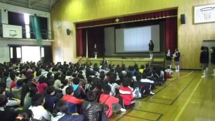 まず体育館で生徒会本部役員が、「桂中○×クイズ」で盛り上げてくれました。そののち、プロジェクターを使って学校生活の紹介を、最後に校長先生から歓迎のお話をいただきました。