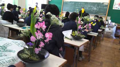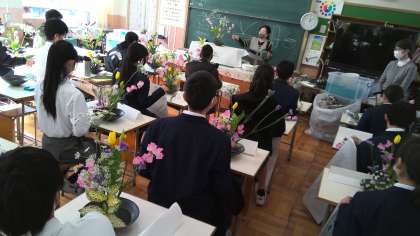 1年生は伝統文化体験で生け花に取り組みました。