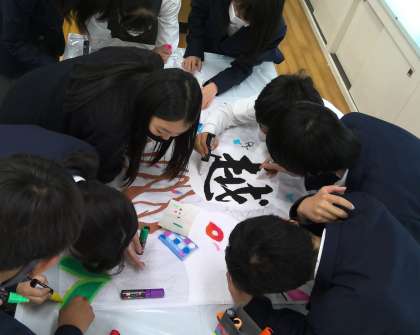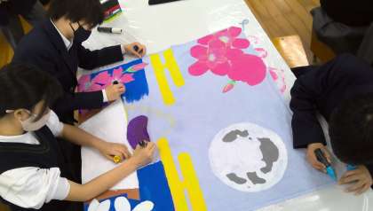 2年生各クラスの有志で、学級旗の制作が急ピッチで進行中。間もなく完成予定です。
