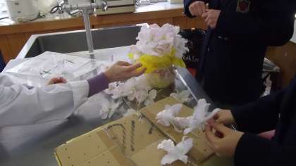 3/6(火)、今週金曜日9日の3年生を送る会に向けて、1年生はコサージュ作りに取り組んでいます。各クラスでの製作はほぼできあがり、今日は代表生徒が先生と一緒にきれいに形を整えて、プレゼント用に仕上げをしてくれていました。