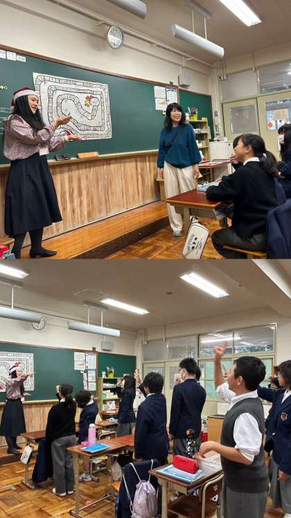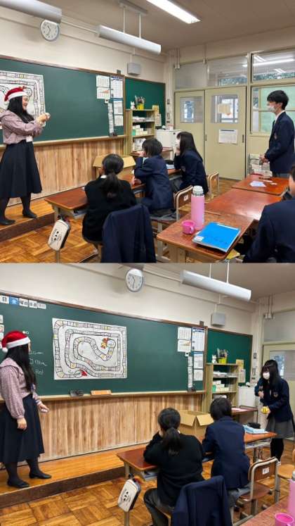 今日の英語ではエミリー先生作成の英語すごろくをしました。英語の質問に正しく答えるともらえるプレゼントカードをチームで何枚集まることができるか競いました。どのチームも笑顔で楽しく学習している姿が輝いていました。