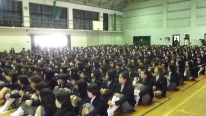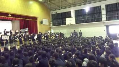 校歌斉唱、校長先生(今日は代理として教頭先生)のあいさつに続いて、各部活動の紹介が行われましたが、各部代表生徒はいろいろな工夫をしていました。笑いあり、うけるはずのネタがすべって苦笑いあり・・・の楽しい時間でした。