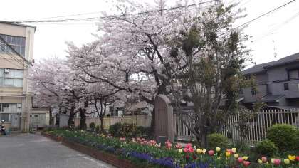 先日もお伝えしましたが、桜の下の花壇のビオラ・なでしこ・チューリップがきれいに咲き始めており、桜のうすいピンクと色とりどりのこれらの花のコントラストがとてもきれいです。