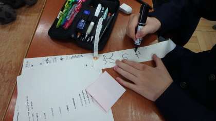 本日4限3年生で修学旅行にむけての取り組みを行いました。長崎平和セレモニーでの平和宣言文を各班で作成しました。1人1文字ずつ,思いを込めて書きました。