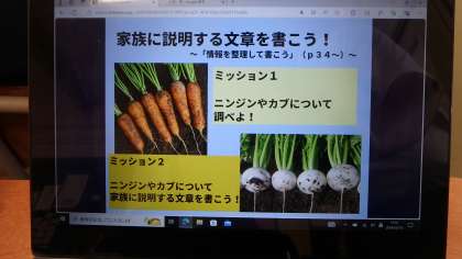 家族にニンジンやカブについて調べ、家族に説明する文章の作成をしていました。