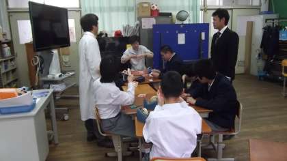 5/2(水)3限目、校内を回っていたら、1組の授業(理科)で何やら楽しそうな活動をしていました。1組の理科授業は3名(今日は初任研の指導の先生も含めて4名)が授業を担当していますが、毎回実験や観察を中心にいろいろな工夫をしながら授業をしています。