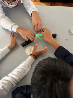 1組の理科は「光の進み方」について学習しています。光には3つの進み方(直進、反射、屈折)があることを学んだあと、理科室で3色LED(RGB)を使った実験をしたり、太陽光をプリズムにあてて虹ができる様子を観察したりしました。