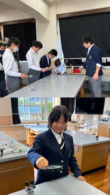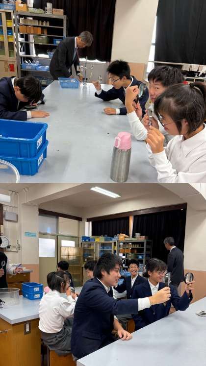 今日の理科の授業では凸レンズや凹レンズの虫メガネを使って光の曲がり方を学習しました。生徒たちは楽しみながら知識を深めていました。