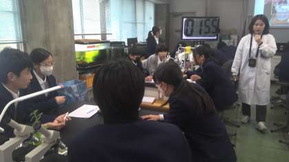 本日午後から1年生は科学センター学習を実施しました。内容は、プラネタリウムと各教室で実験でした。実験のテーマは、2組と4組が生物【植物のメッセージ】、3組が化学【つくって学ぼう あわパワー!】、5組が物理【しょうとつのエキスパートに君はなる!】、6組は地学【Re:Bone】です。写真は2・4組の生物【植物のメッセージ】のようすです。匂いに関することをテーマに植物や生物をつかって実験をすすめていました。