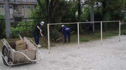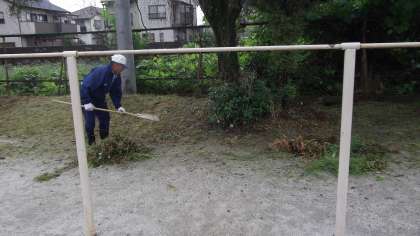 6/9(土)小雨が降る午後1時30分より、西京少年補導委員会の有志の方々が、本校東側の草刈りを行っていただきました。