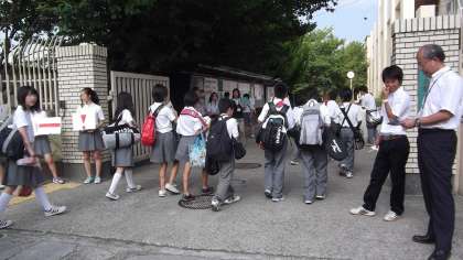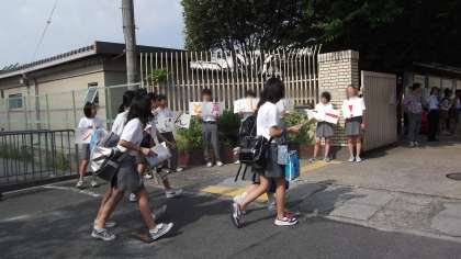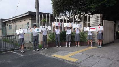それに呼応して朝の忙しい時間帯ではありますが、たくさんの本校教職員も校門に出て協力していました。